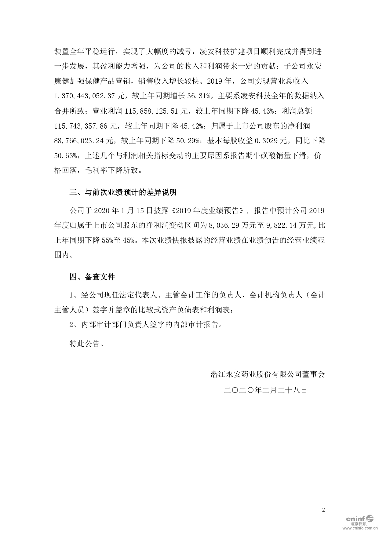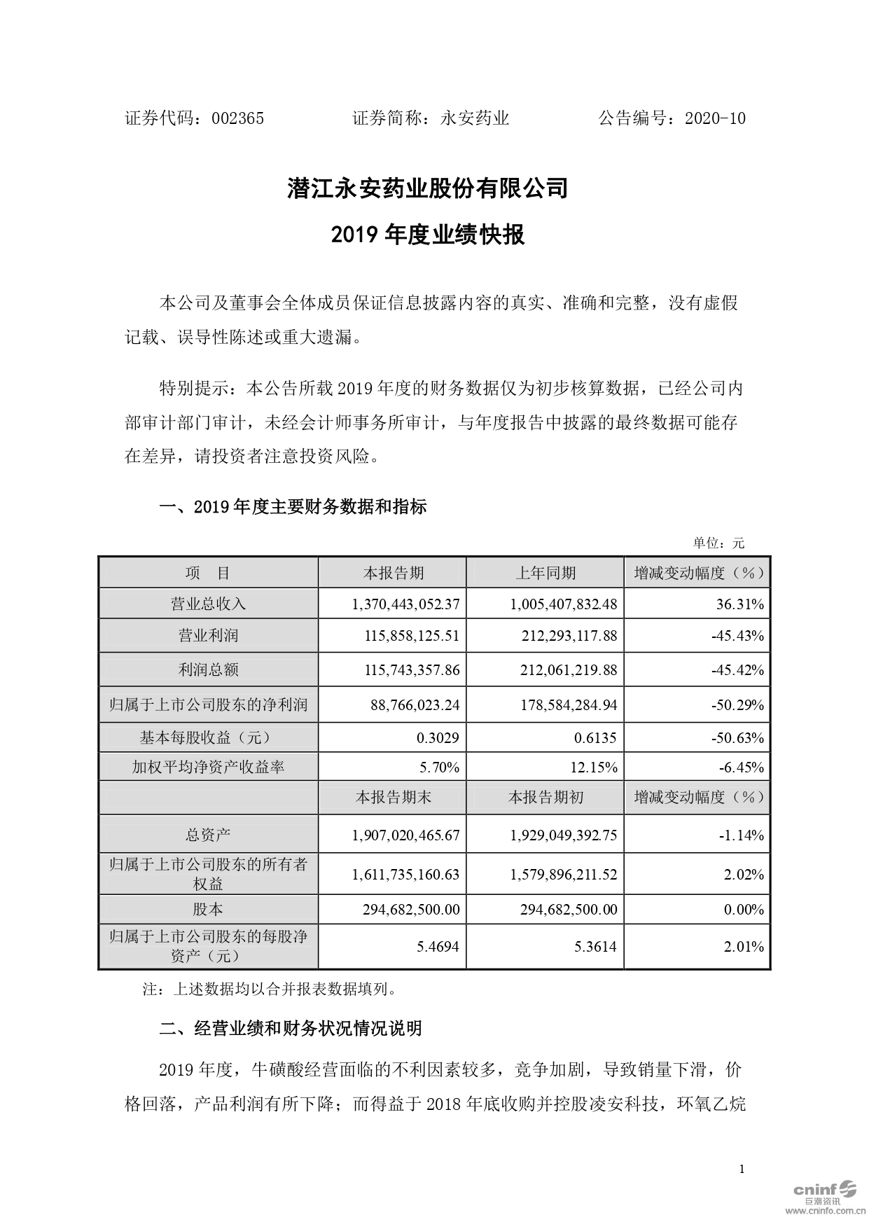 2019年度業(yè)績快報(bào)