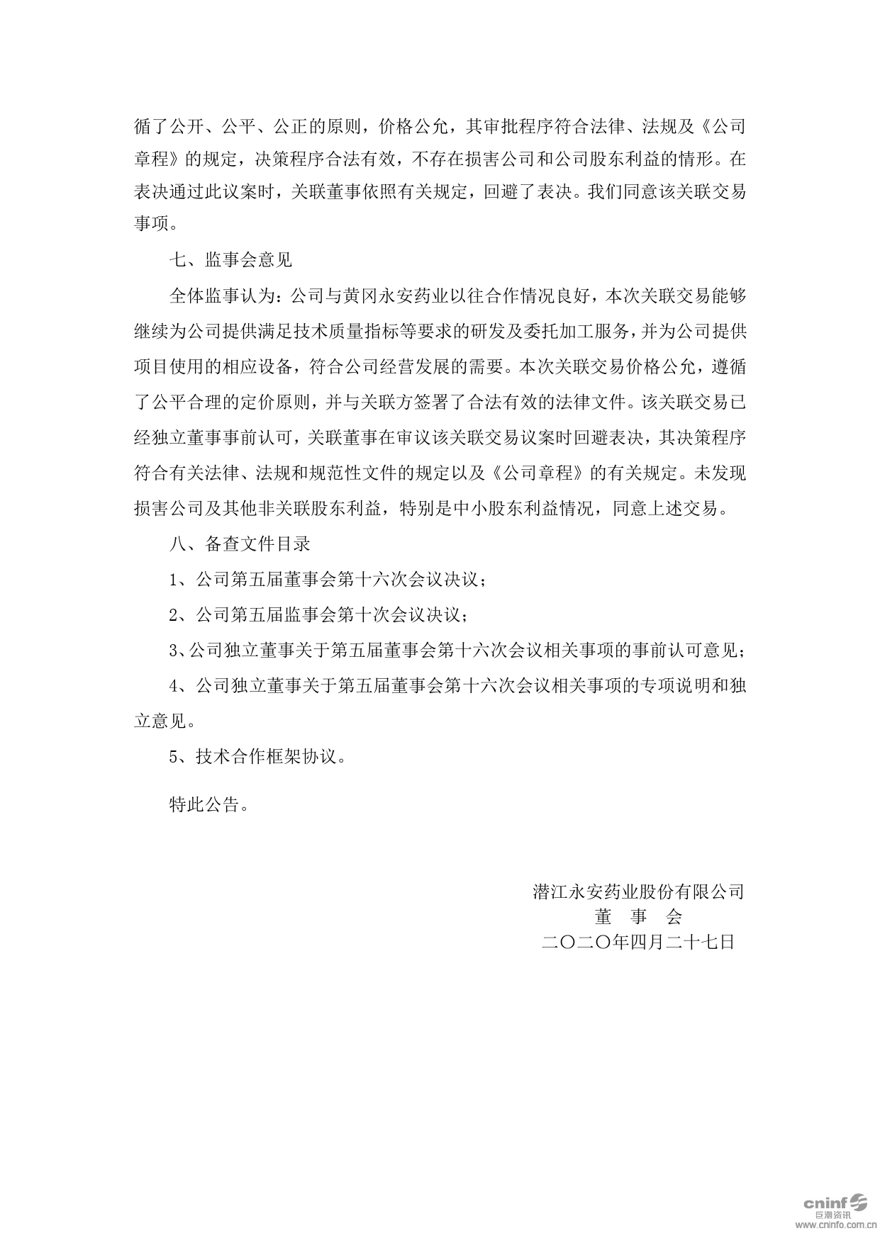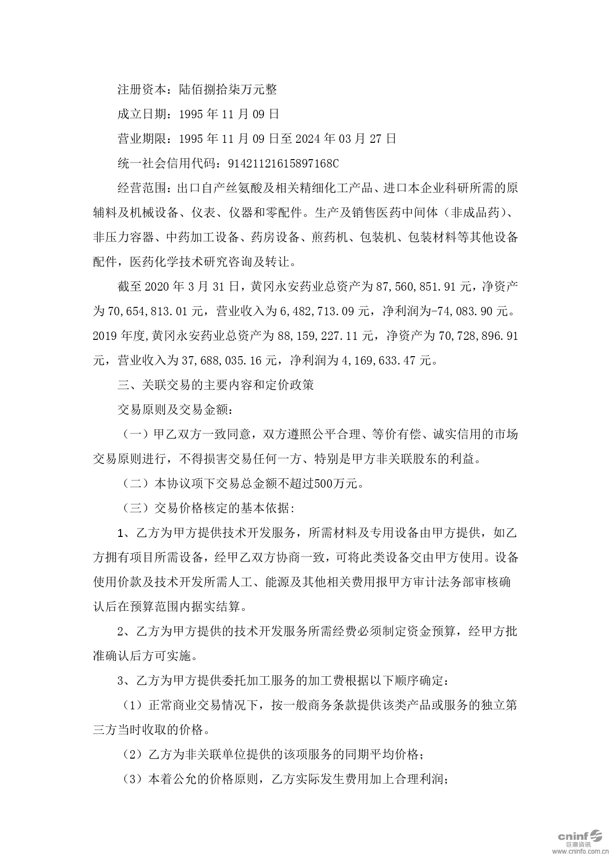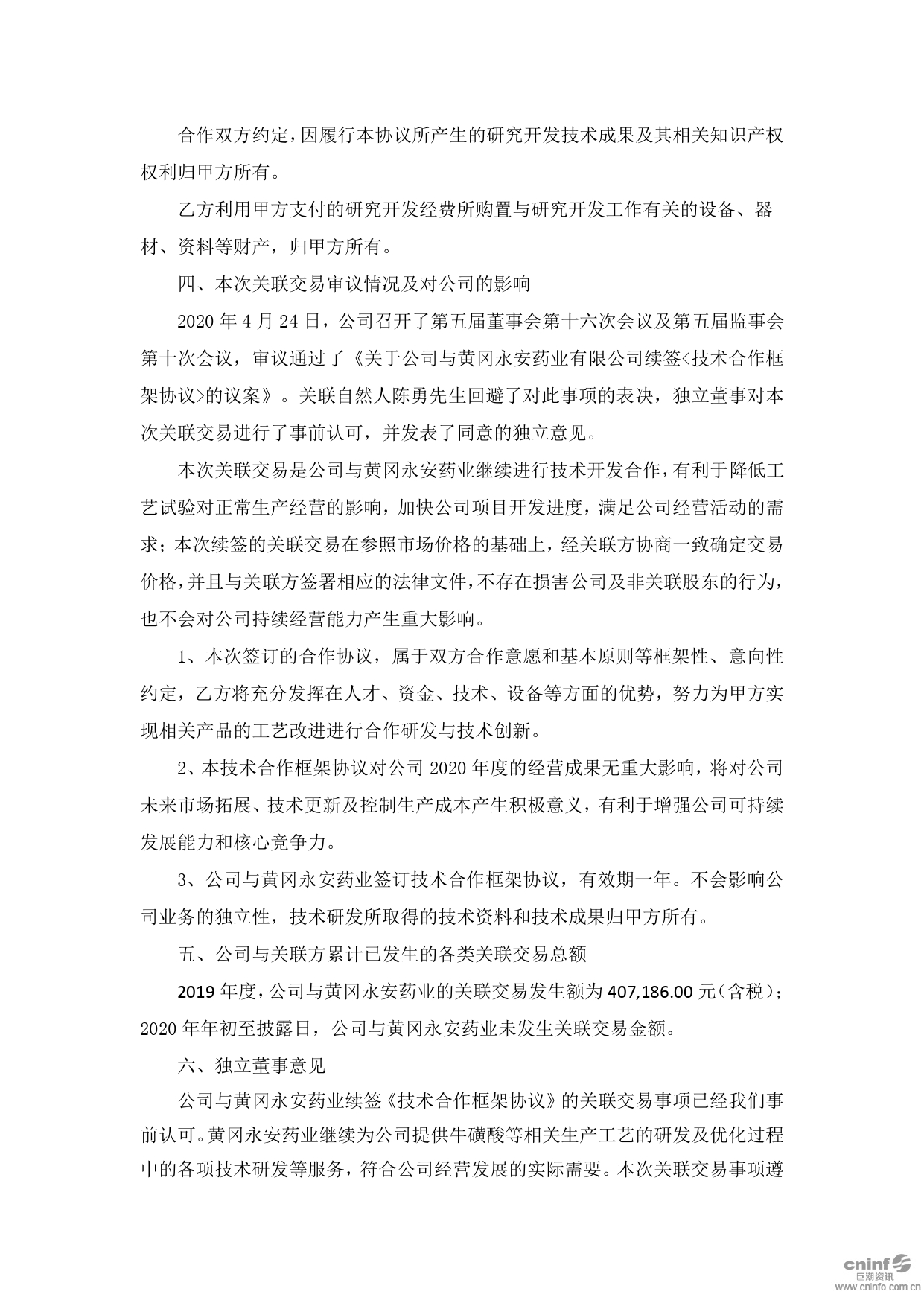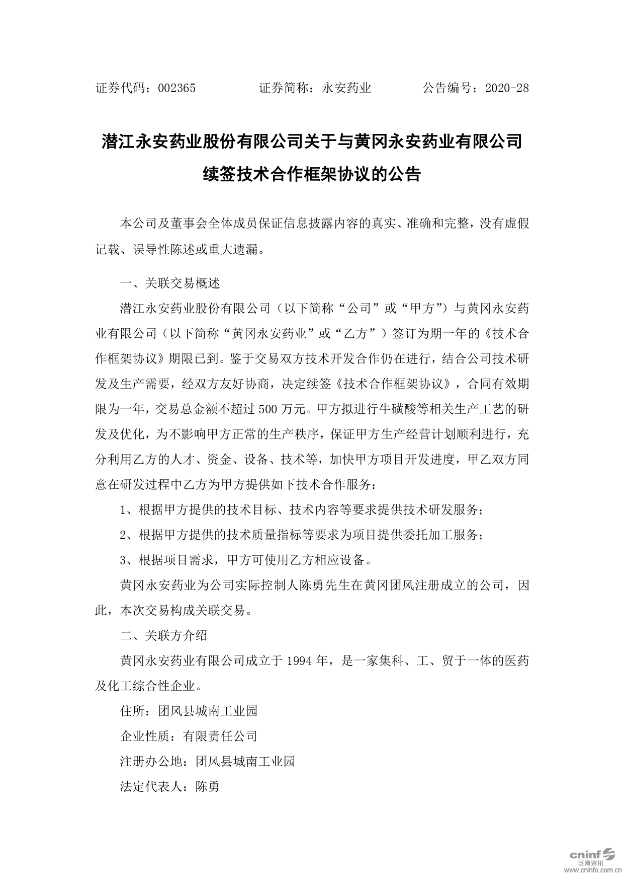 關(guān)于與黃岡永安藥業(yè)有限公司續(xù)簽技術(shù)合作框架協(xié)議的公告